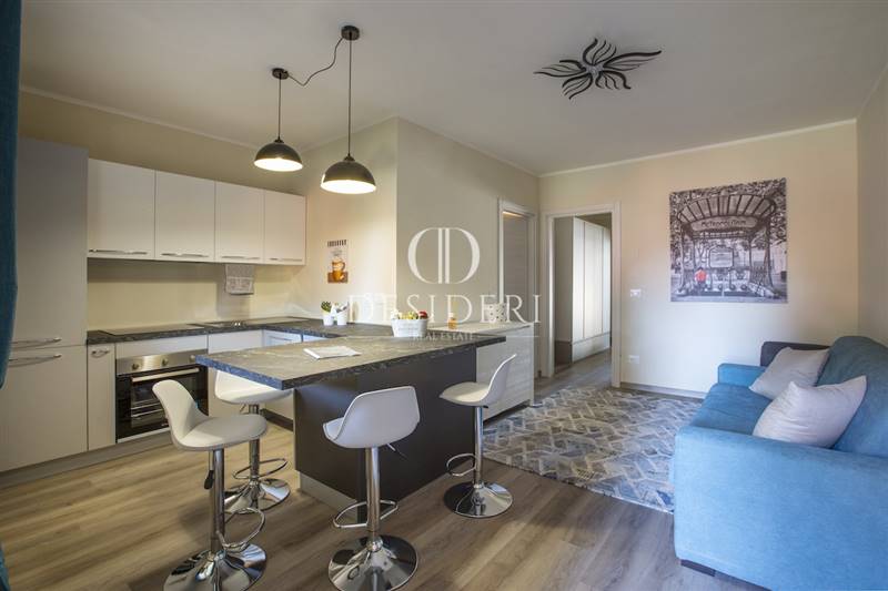L'ingresso si apre su un luminoso soggiorno open space con cucina a vista, un ambiente moderno e funzionale, perfetto per momenti di relax.