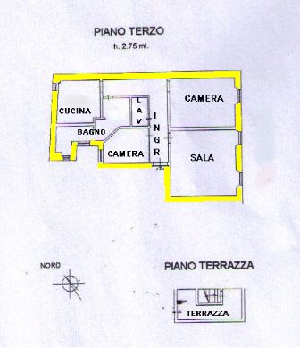 Appartamento ristrutturato di circa 65 mq, posto al piano terzo ed ultimo in blocco di sole tre unità, composto da ingresso, soggiorno, cucinotto, camera matrimoniale, camerina-studio e bagno finestrato. Cucinotto arredato.