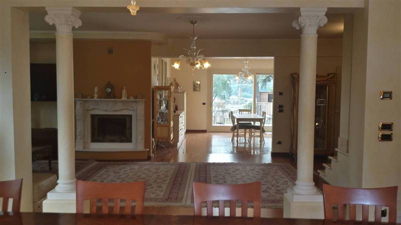 Il piano terra di circa 140 mq è munito di retrocucina, cucina servita da un finestrone di 3.70 ml. collegato ad un terrazzo di 250 mq ,(con autorizzata una tettoia removibile di circa 105 mq attualmente non realizzata) e al giardino di circa 850 mq, soggiorno con camino ad areazione forzata.