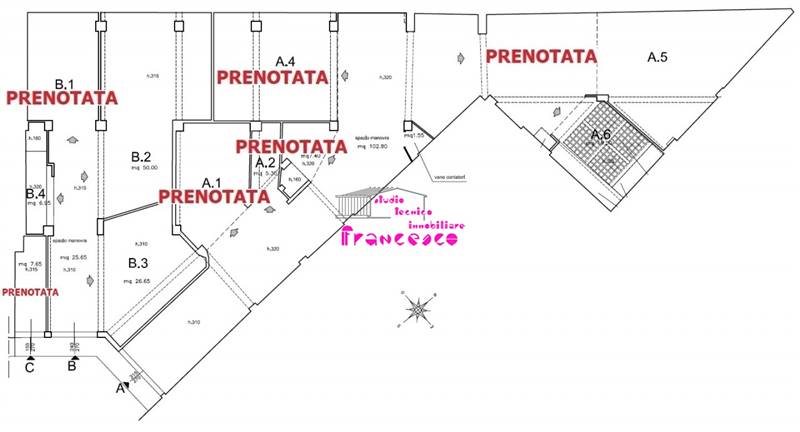 Il BOX AUTO rimasto ha consistenza molto generosa di mq.50; la LUNGHEZZA INTERNA è ben oltre i m.5,50, permettendo così il parcheggio di qualsiasi autovettura, e le larghezze variano da m.3,75 a quasi metri 6!