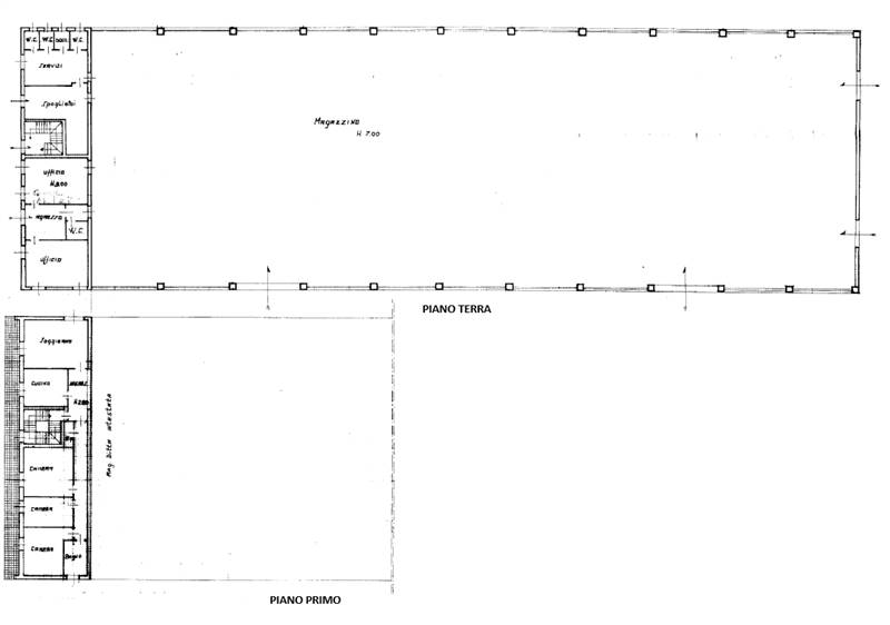 L'interno è così suddiviso: a piano terra 1.627mq circa di area produttiva con servizi e spogliatoi, altezza sottotrave di 7m, unica campata con pilastri dotati di mensola carroponte; 67mq circa di uffici sempre a piano terra; alloggio di 134mq circa a piano primo.