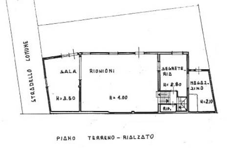 La costruzione, di tipo autonomo, si distribuisce su tre piani: a piano terra una grande sala adibita a sala riunioni di 175mq circa suddivisa in due vani; a piano rialzato un ufficio di 25mq circa; a piano primo un altro locale di 35mq circa; a piano seminterrato i locali igienici, scale e la cantina di 45mq circa.