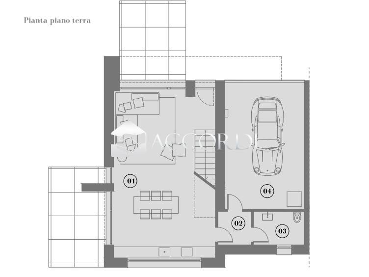 Il progetto prevede il piano terra con una zona giorno di mq.42, un bagno/lavanderia, garage di mq.30 .
